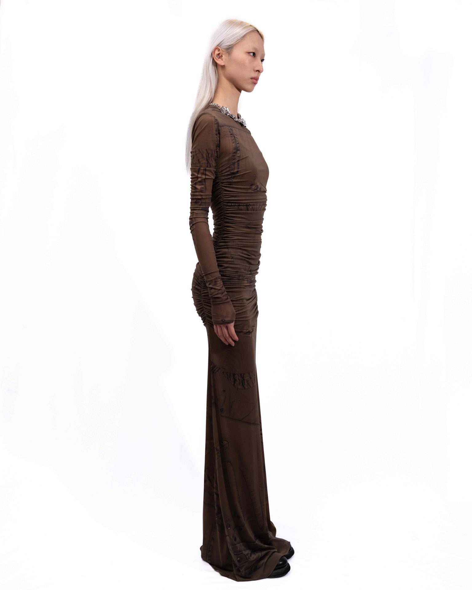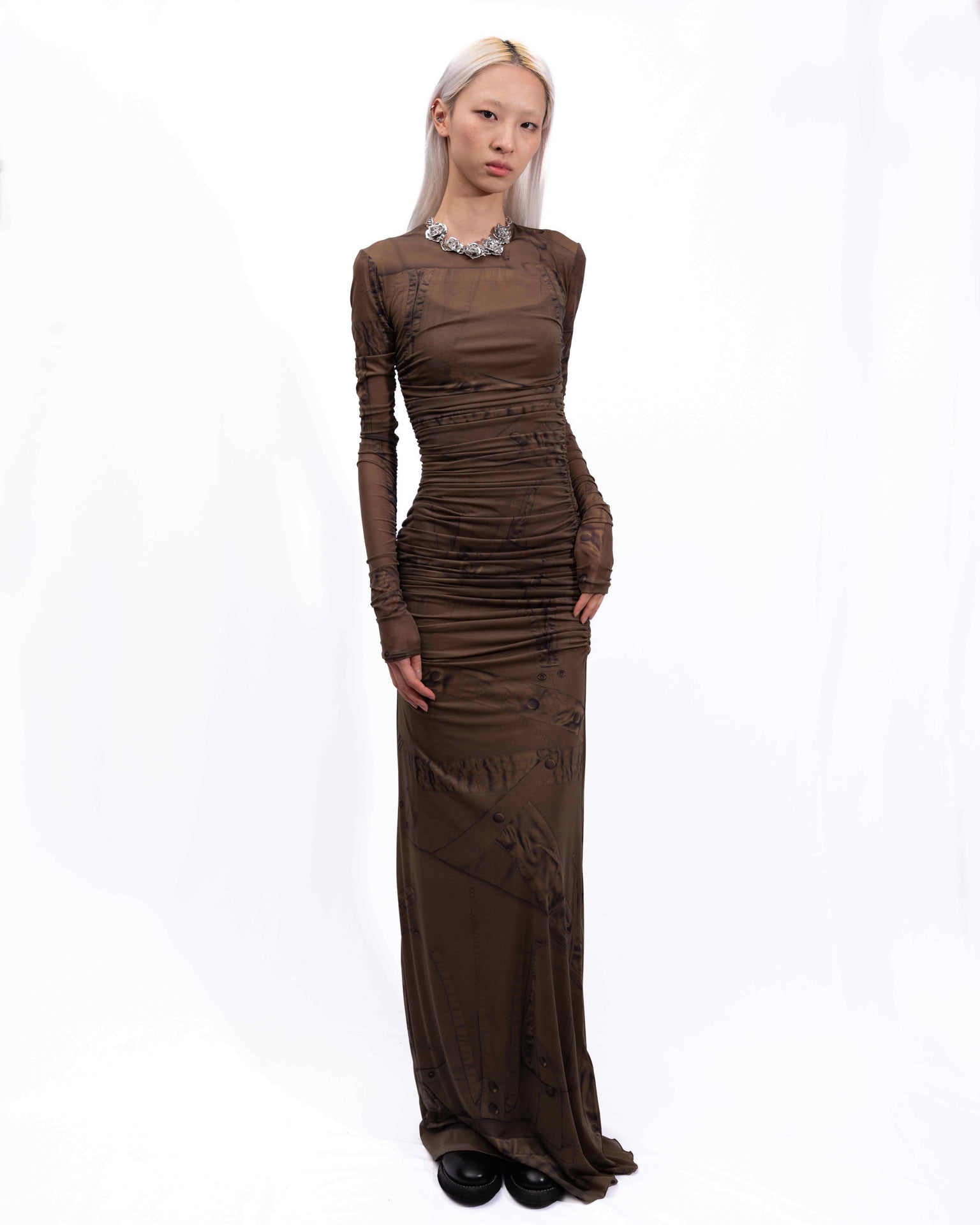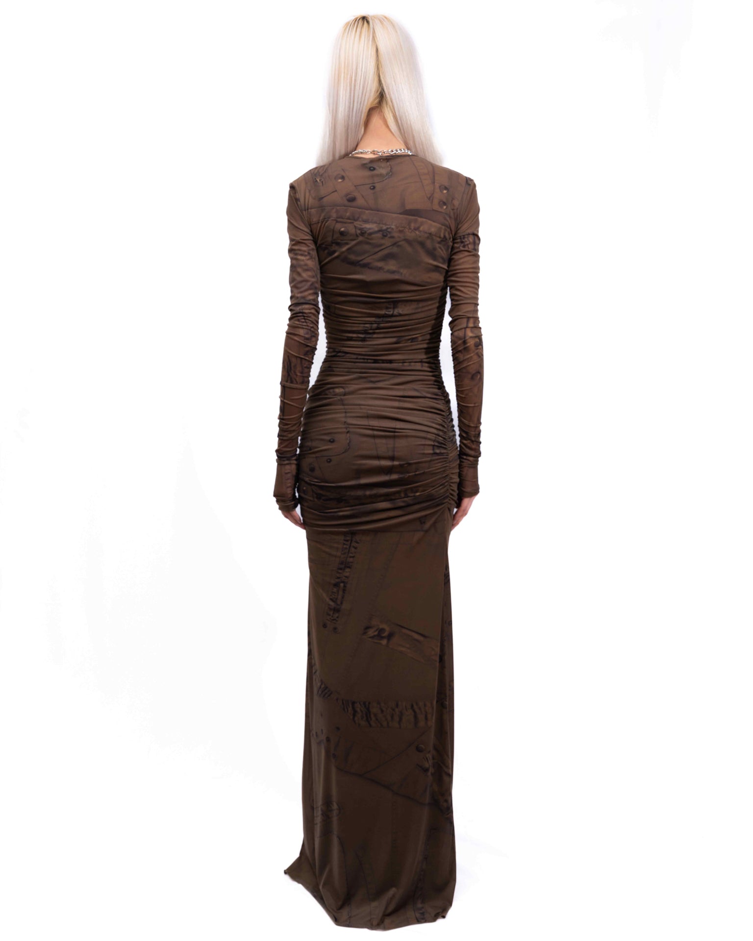 Long dress with a round neckline featuring an exclusive cargo patch print. Long sleeves, ruffled waist, short train.