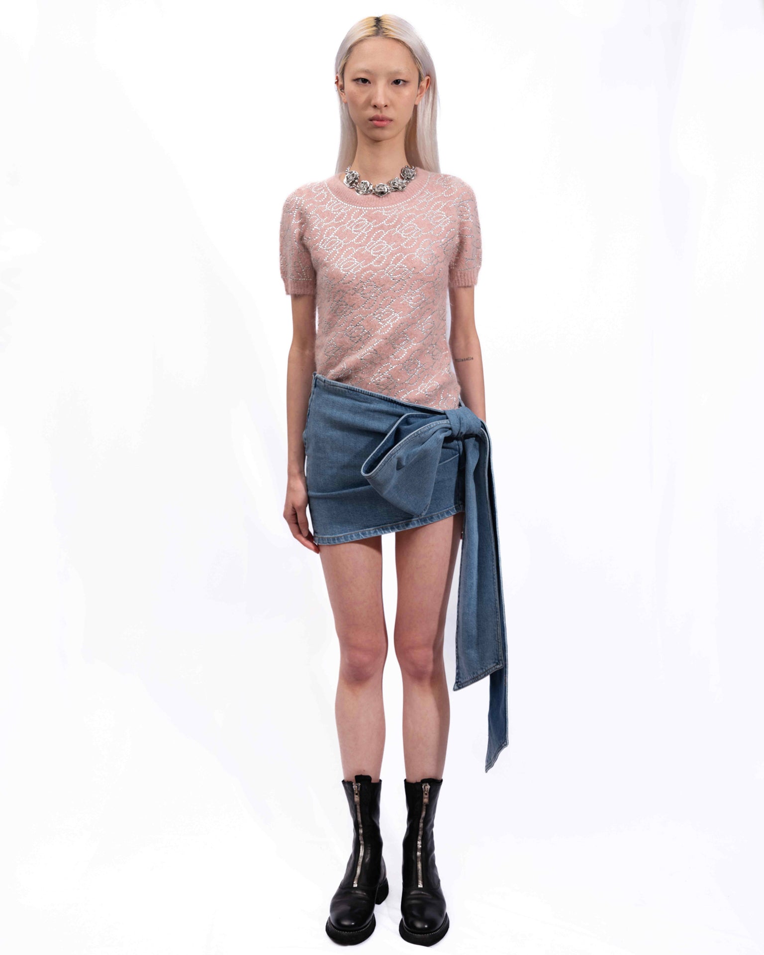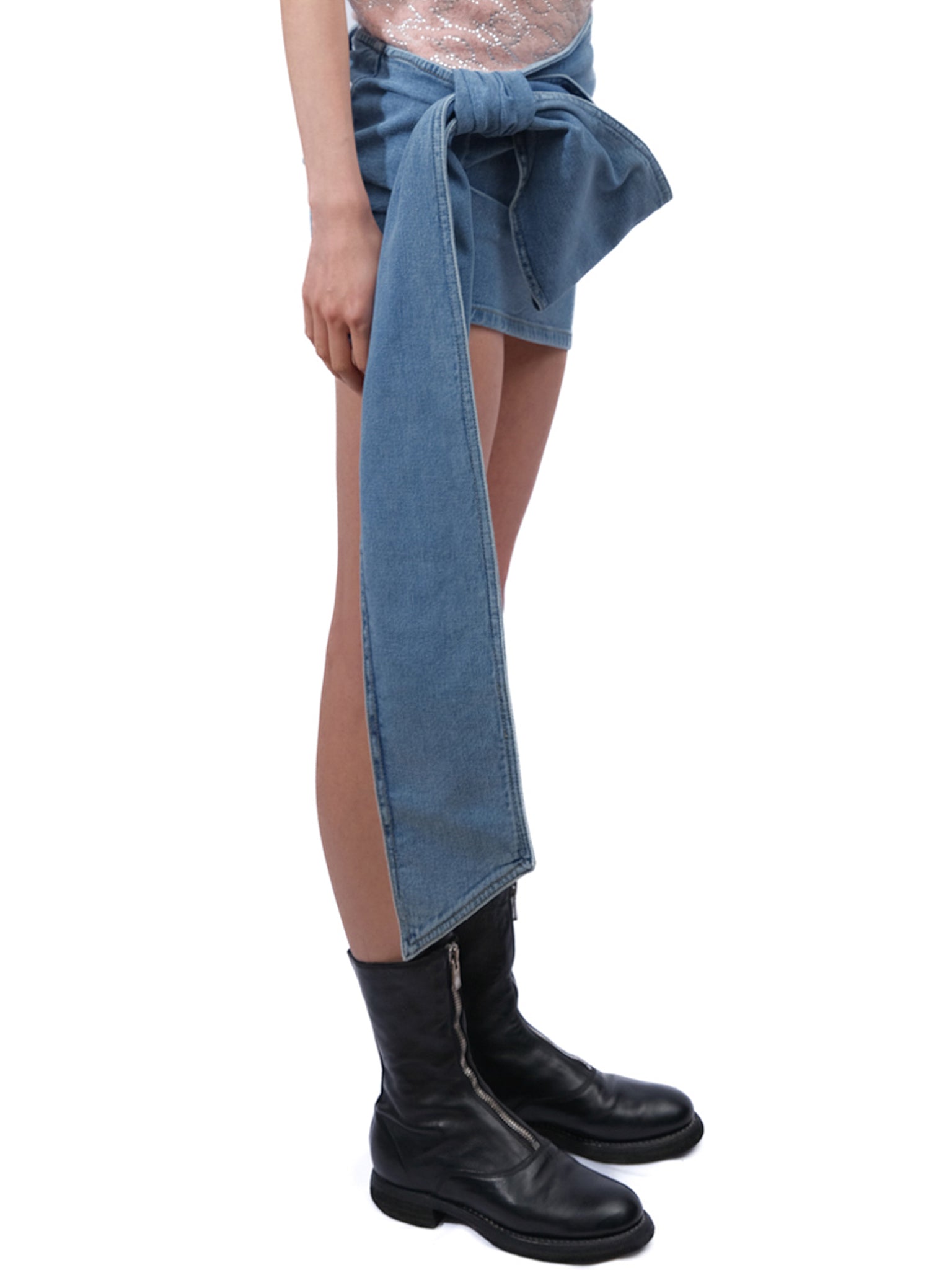 Mini skirt in medium wash denim features sash elegantly tied in a bow on one side. The pleated front and the asymmetrical bottom add a unique touch.