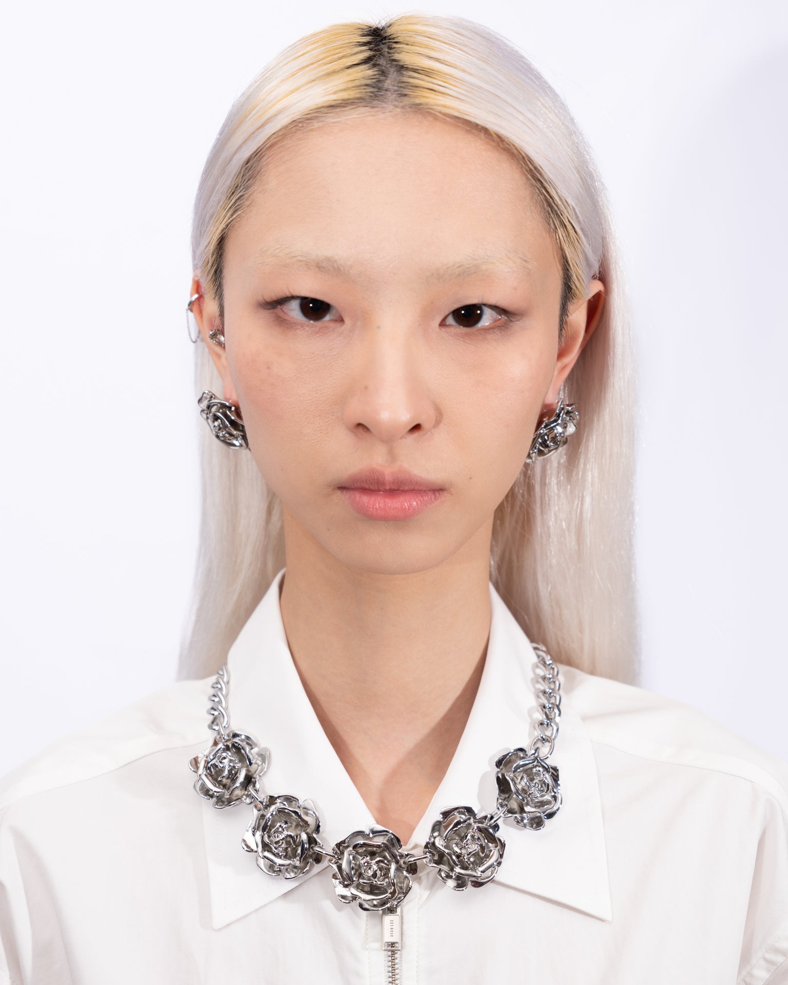 In silver metal alloy, chain detail, flower decoration, silver hardware.