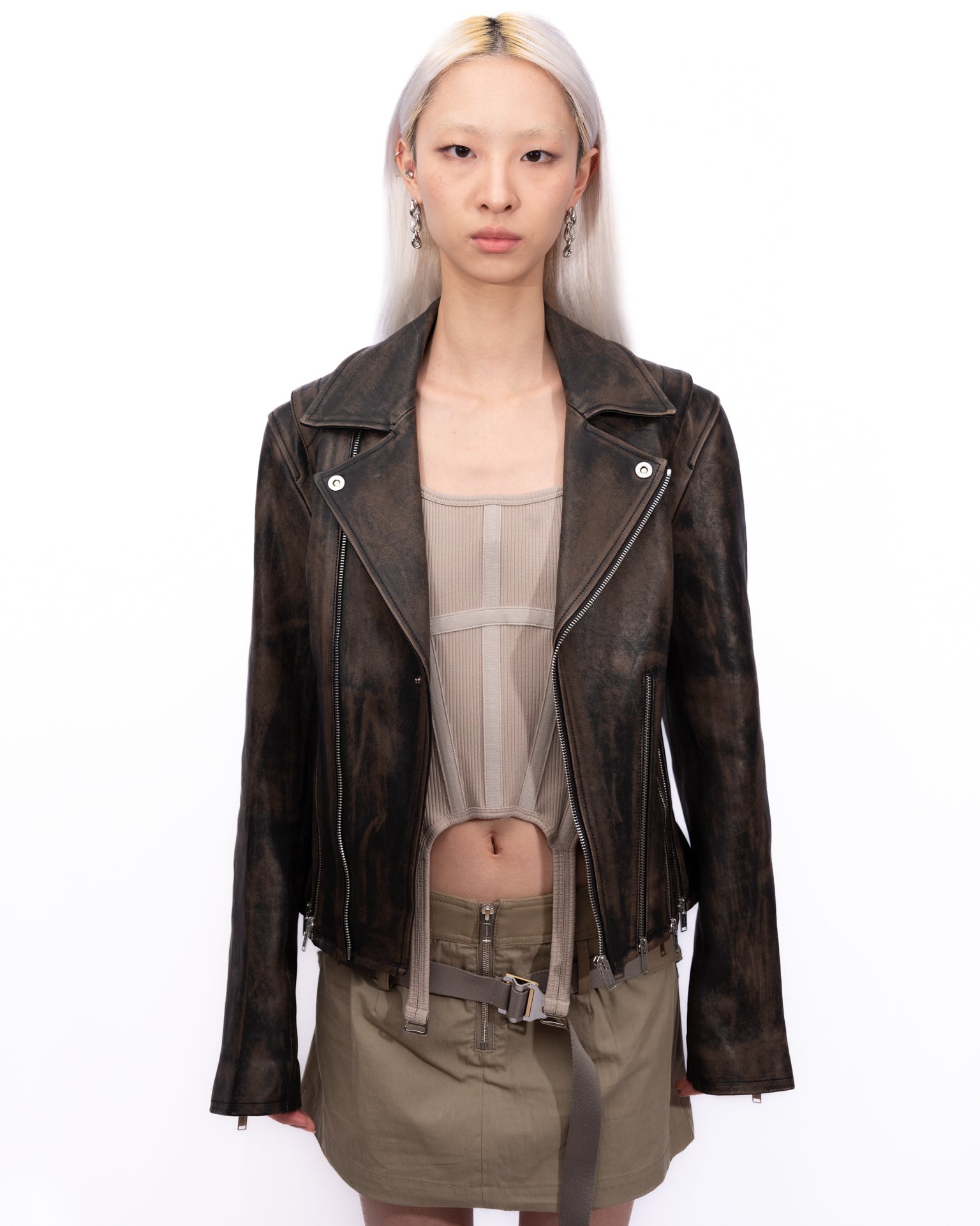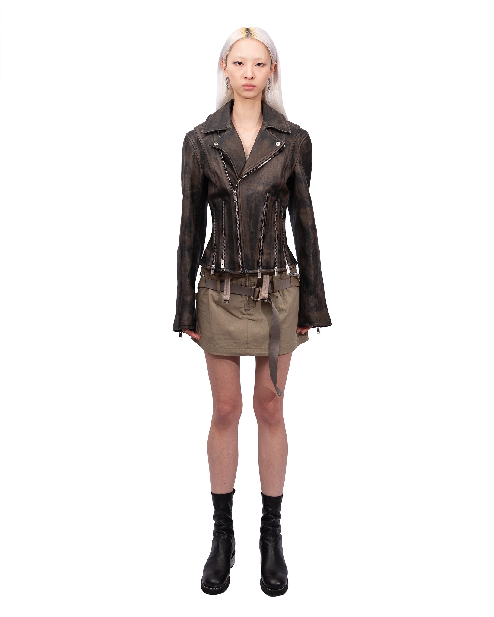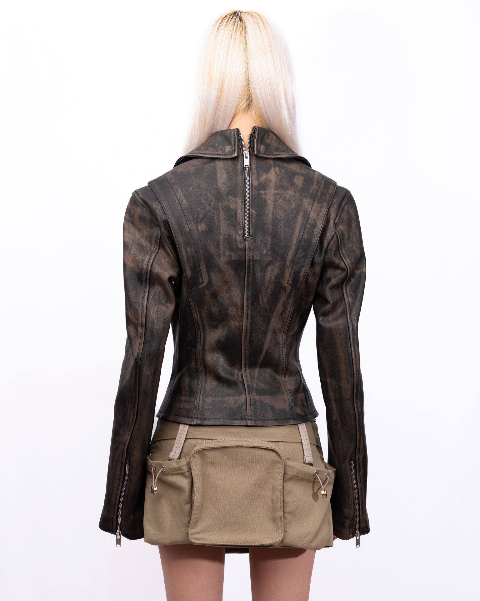 Hand-treated grained calfskin jacket. Zip fastening at back collar for alternate off-the-shoulder styling.