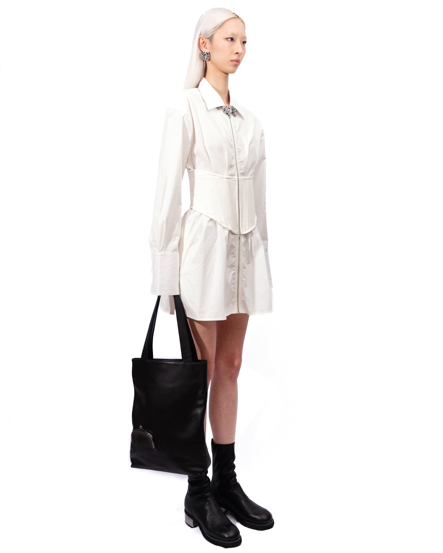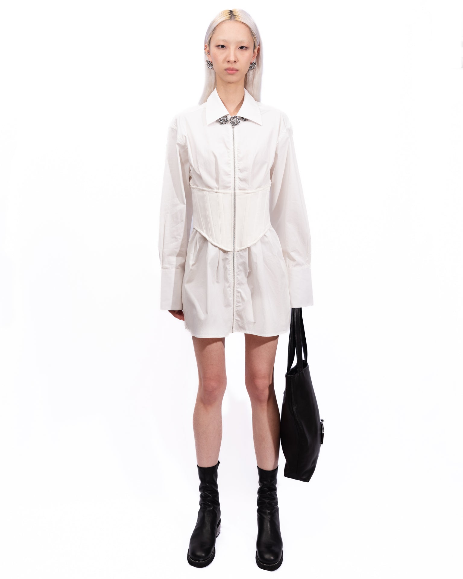 Long sleeve mini dress crafted in a cotton blend technical shirting. Featuring tucks at waist with encased boning. Detailed with hook and eye centre front placket and turnback cuffs with two-tone eyelet snaps.