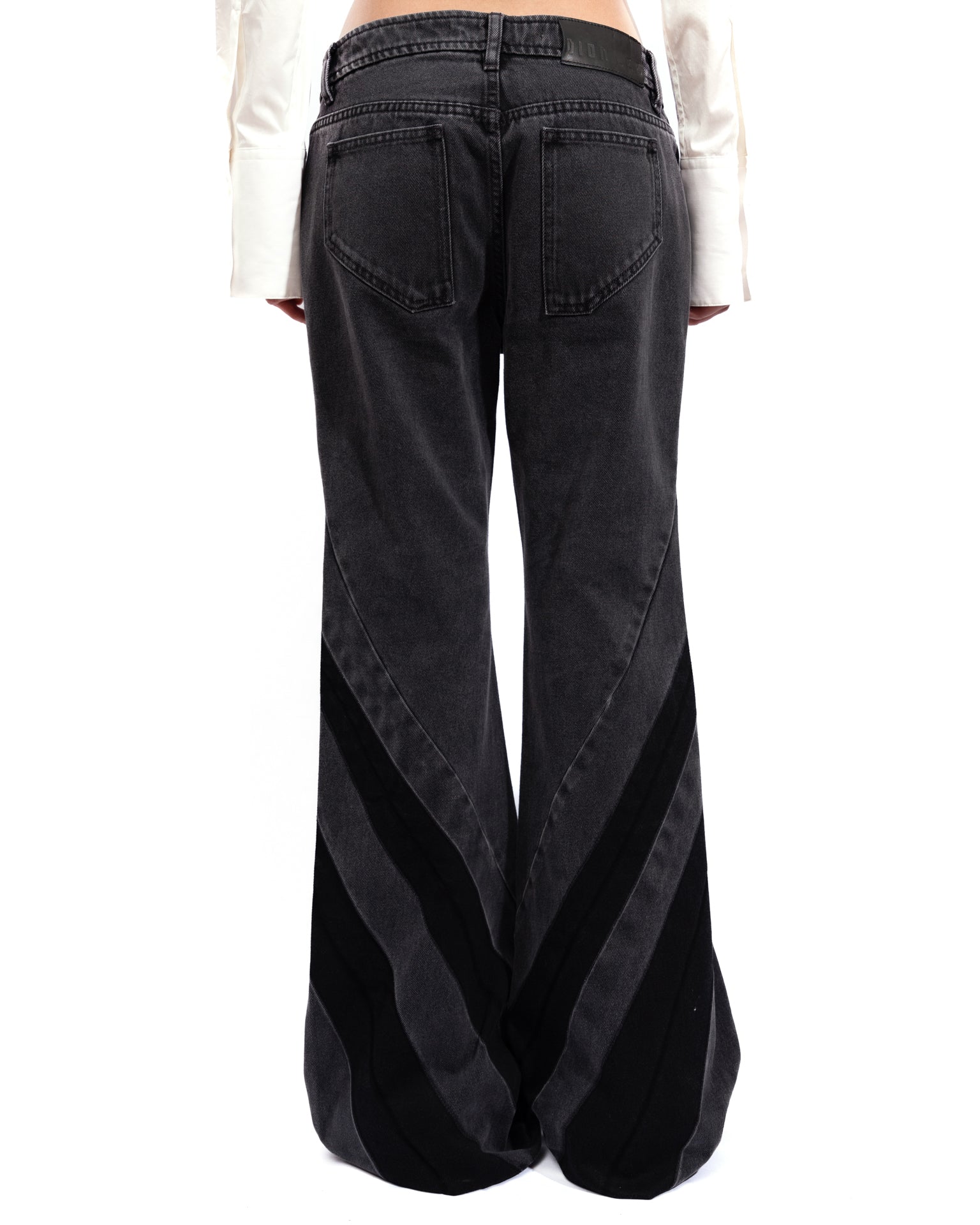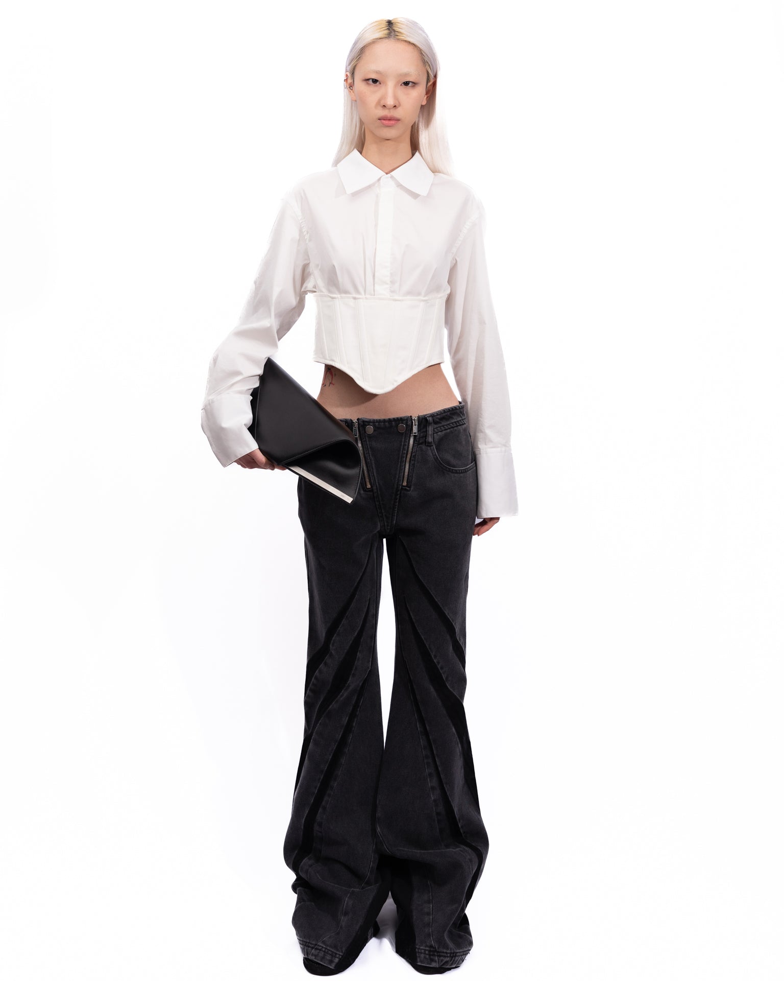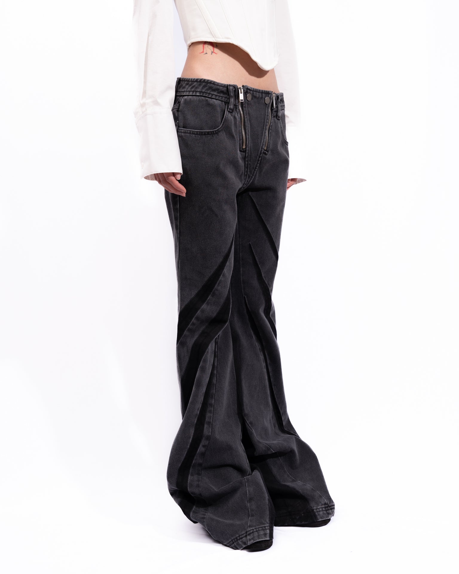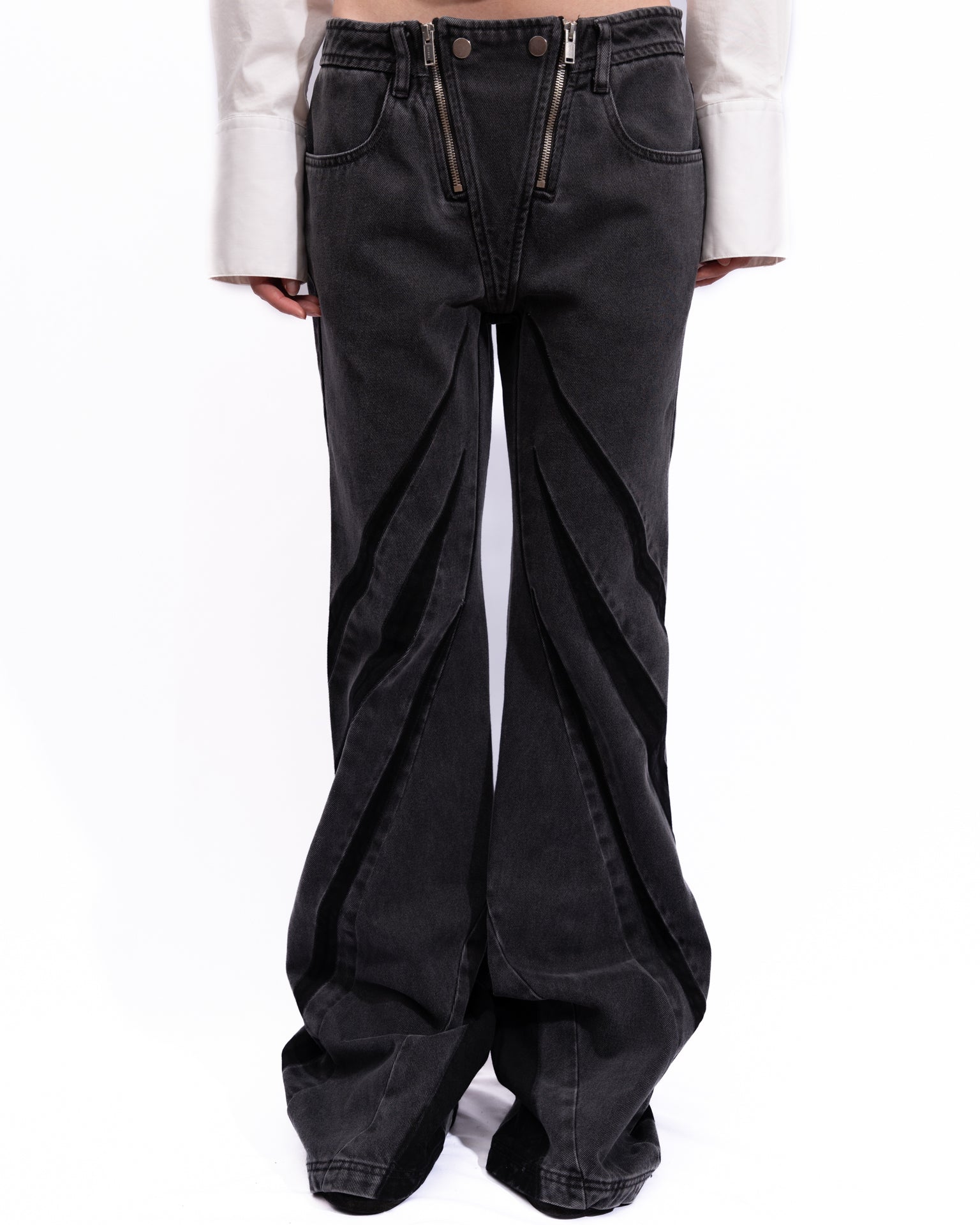 Low waisted flare jeans decorated with contemporary darted panelling.