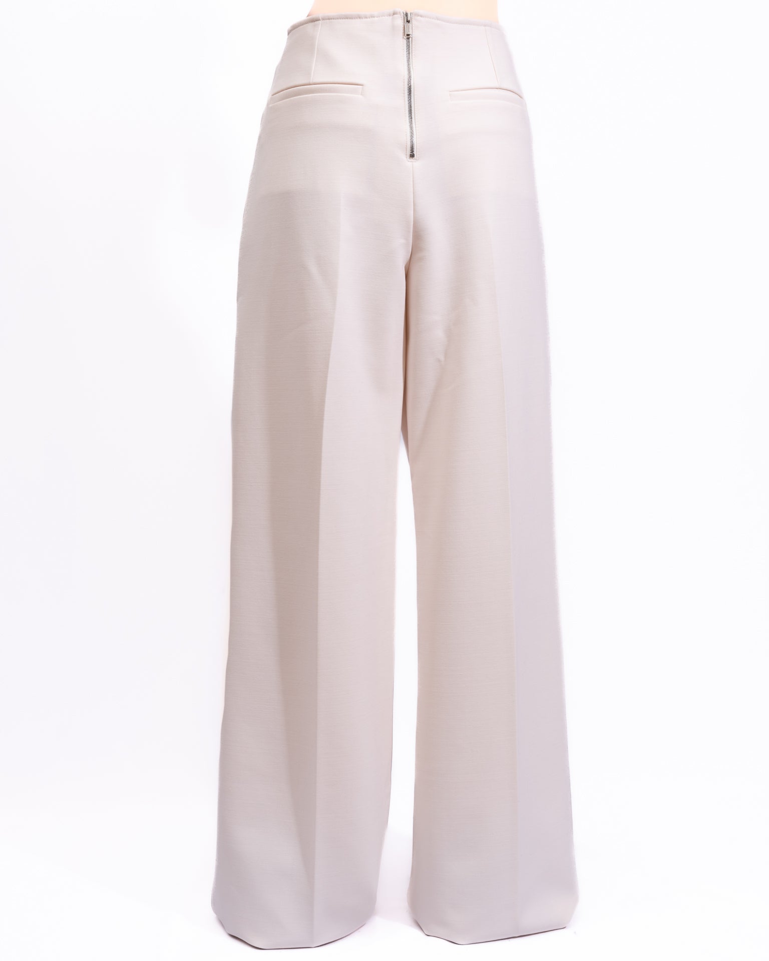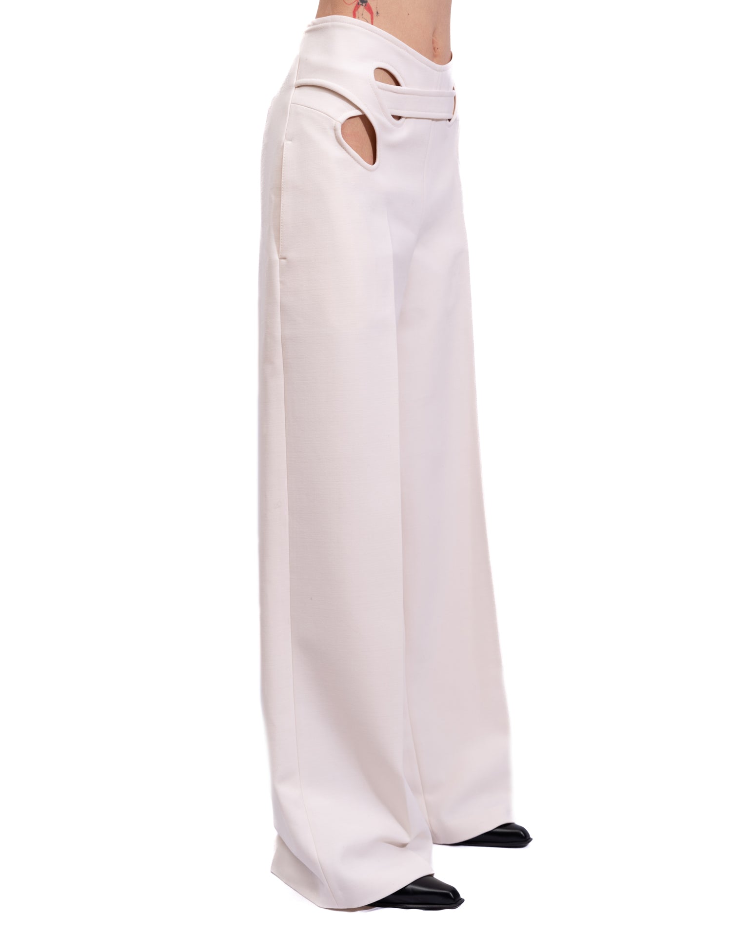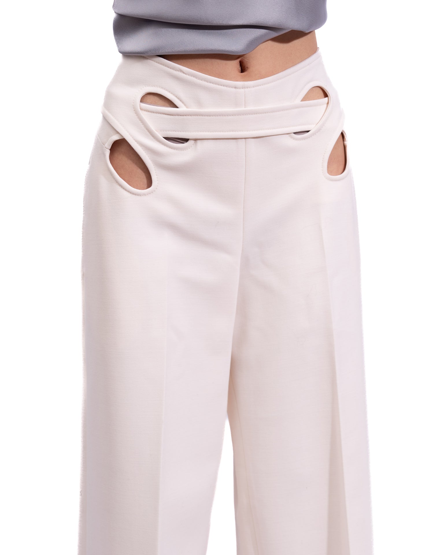 Low rise tailored pant detailed with cut-outs at front waist and interlooping waistband.