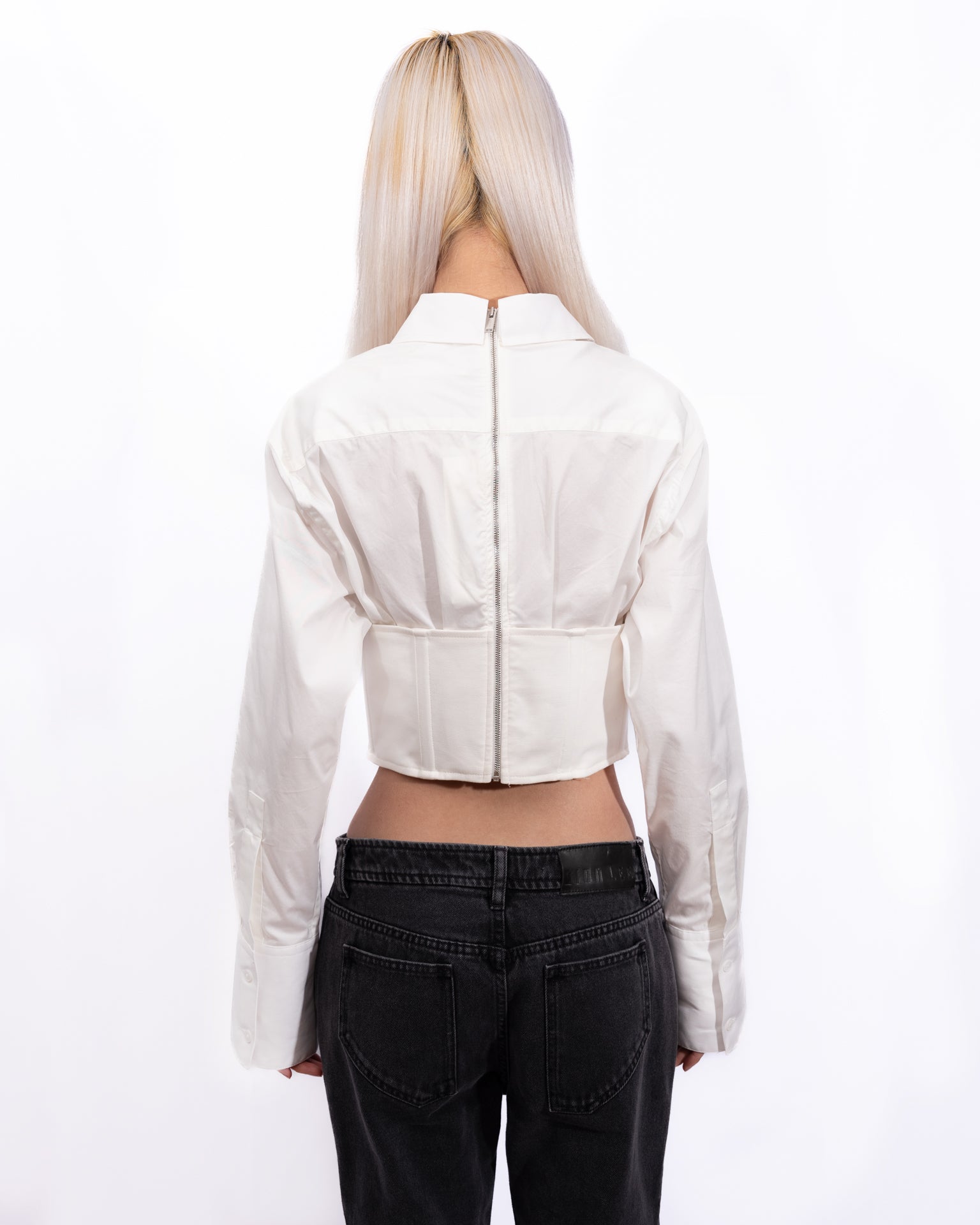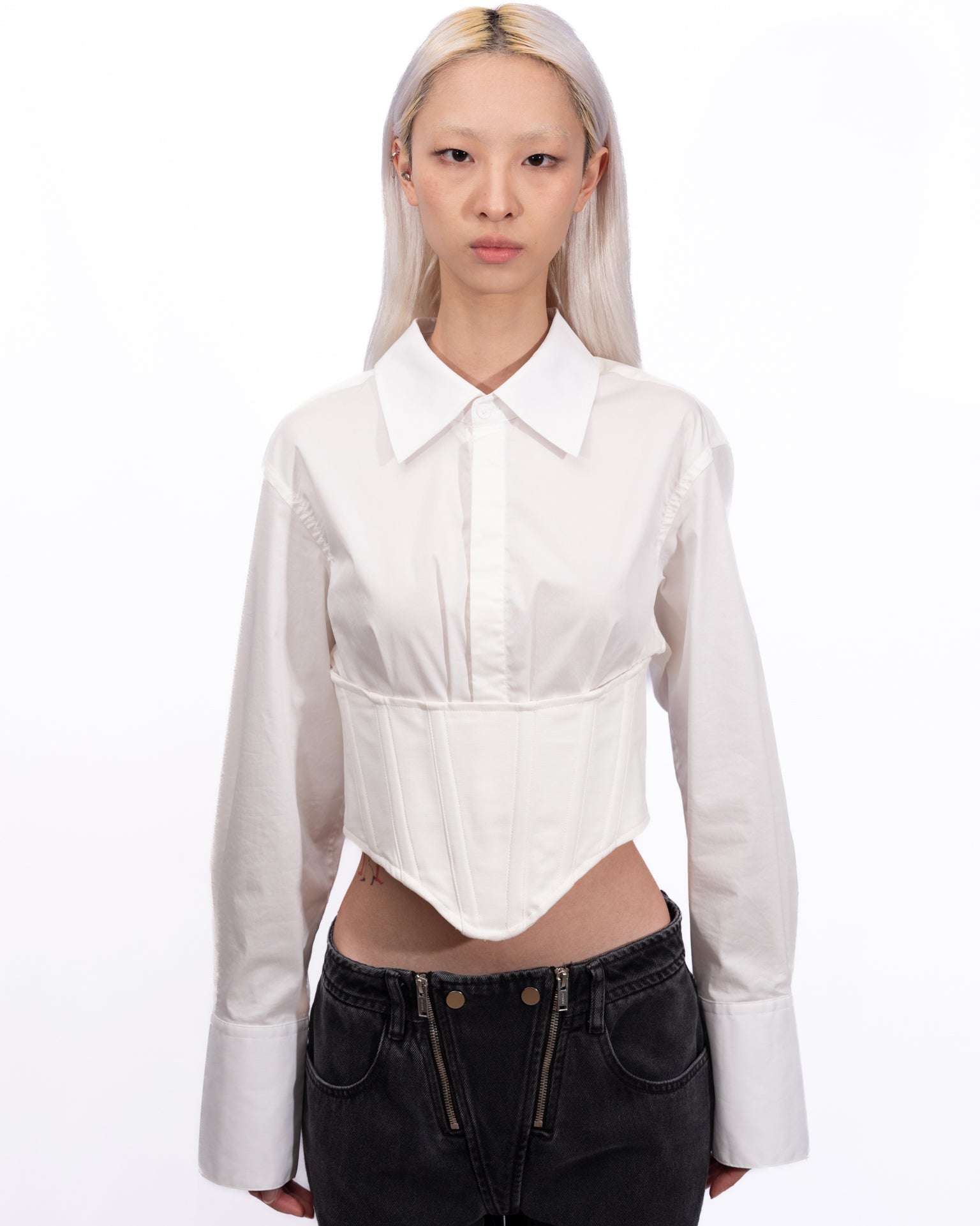 Stretch organic cotton twill and organic cotton drill corset-style shirt. Boning at corset-style overlay.